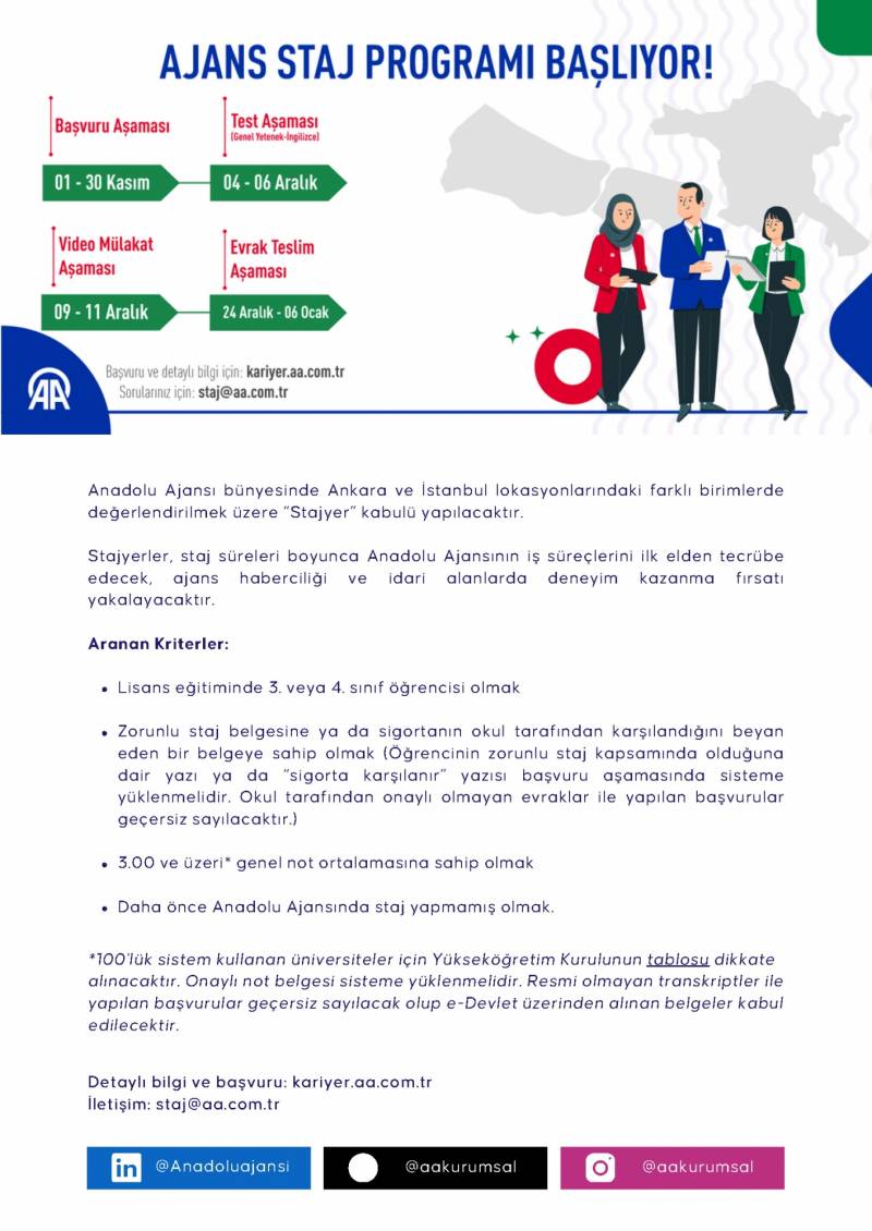 Anadolu Ajansı (AA), Ankara, İstanbul ve çeşitli bölge müdürlüklerinde farklı birimlerde görevlendirilmek üzere 2024 kış dönemi için stajyer alımı yapacaktır. Stajyerler, AA’nın iş süreçlerini ilk elden deneyimleme ve ajans haberciliği ile idari alanlarda uzmanlık kazanma fırsatına sahip olacaklardır. Ajans Staj Programı ve Yurt Staj Programı hakkında detaylı bilgiye kariyer.aa.com.tr internet sitesinden ve ekli dosyalardan ulaşılabilir.
